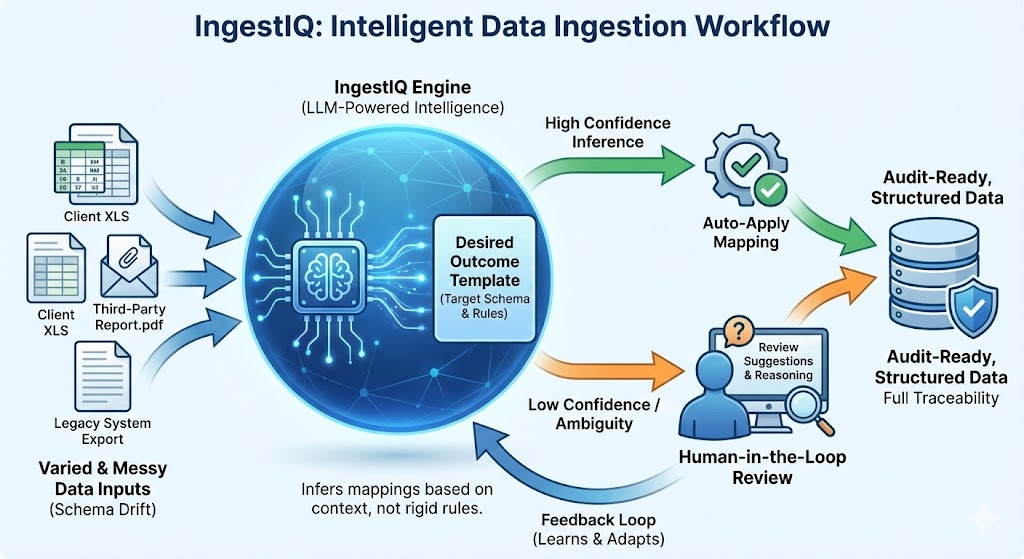 IngestIQ understands structure, intent, and schema drift — transforming unstructured external data into clean, compliant datasets.